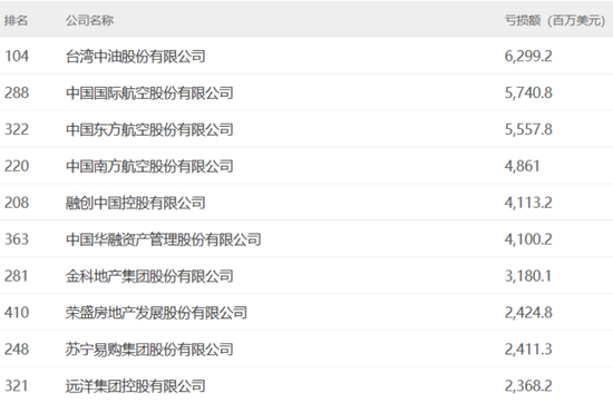 此外,在此次《财富》中国500强中,共计有64家上榜公司没有盈利。在亏损榜前十家公司(第一列排名为营收排名)中,有三家航空公司、四家地产公司。