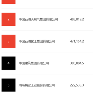 其中,国家电网以5300亿美元的营收位居榜首,中国石油和中国石化分列榜单第二位和第三位,位列第四位的是中国建筑集团。苹果最大代工企业鸿海精密位列第五,是排名最高的中国台湾地区公司,中国平安保险位列第九位。
