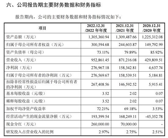 在2020年到2022年的告期内,该公司主要产品为草甘膦及其制剂,2022年草甘膦原药产能15.3万吨,约占同期全球总产能的13%,排名全球第三、国内第二。上述期间,该公司主营业务收入分别为42.55亿元、86.67亿元以及94.92亿元,净利润分别为5184.81万元、15.85亿元以及27.66亿元。