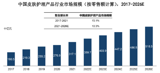 随着居民生活水平的提高、居民对自身健康及肌肤护理的重视程度不断提高、皮肤护理产品种类繁多、可满足需求多样化等多重因素的驱动下,中国居民越来越愿意将更多的支出投入个人护理,促进了皮肤护理产品行业的快速发展。2017年至2021年,中国皮肤护理产品行业市场规模由1,805亿元增长至3,171亿元,年复合增长率为 15.1%。2021 年至 2026 年,预计中国皮肤护理产品行业将保持10.3%的年复合增长率增长,预计到 2026 年中国皮肤护理产品行业的市场规模将达 5,185 亿元。