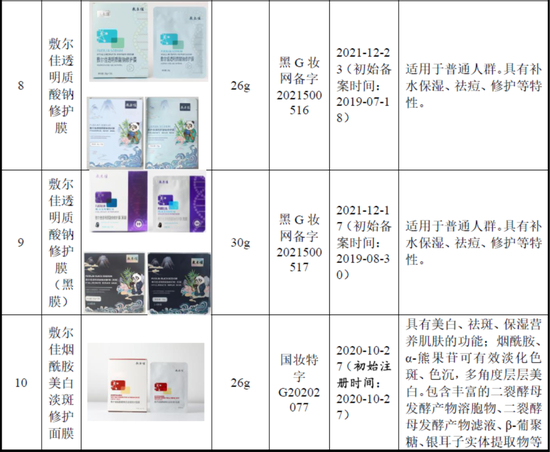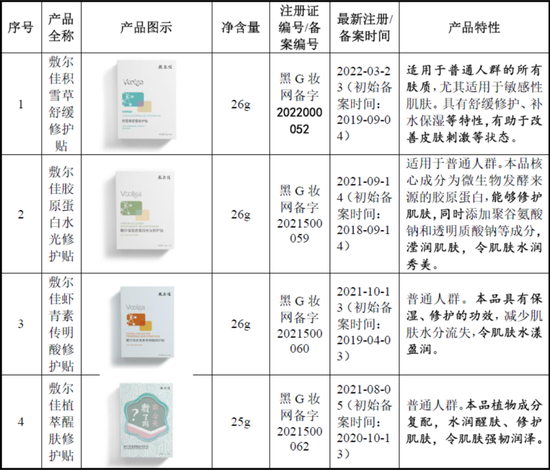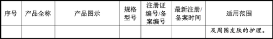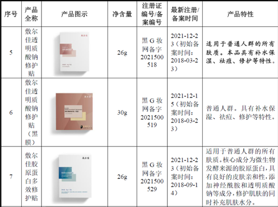 公司产品主要分为医疗器械类敷料产品及化妆品类功能性护肤品,其中,部分具体名称、 规格和功效情况如下: