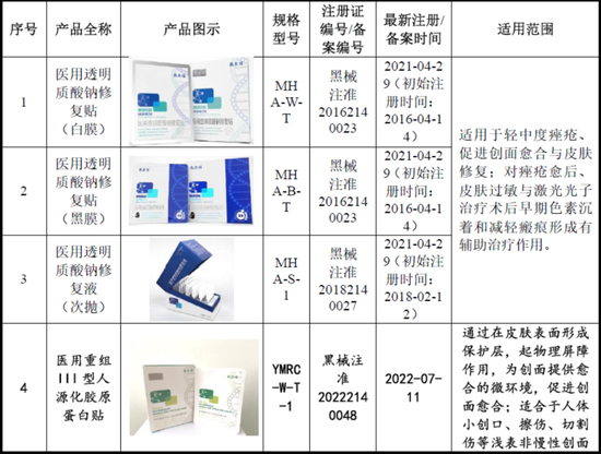 公司在售产品覆盖医疗器械类敷料产品和功能性护肤品,主打敷料和贴、膜类产品,并推出了水、精华及乳液、喷雾、冻干粉等多形态产品。基于对透明质酸钠及胶原蛋白的研究,公司形成了以适用于轻中度痤疮、促进创面愈合与皮肤修复的 II 类医疗器械类产品为主,多种形式的功能性护肤品为辅的立体化产品体系。