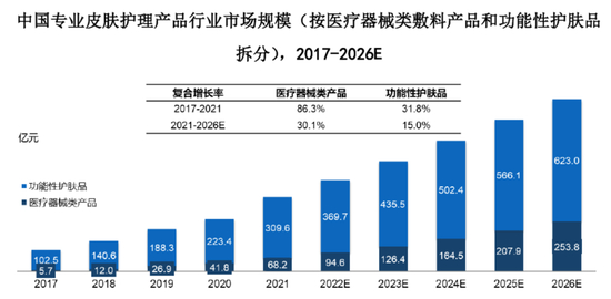 专业皮肤护理产品可以分为功能性护肤品和医疗器械类敷料产品。功能性护肤品和医疗器械类敷料产品的市场规模由 2017 年的 102.5 亿元和 5.7 亿元增长 至 2021 年的 309.6 亿元和 68.2 亿元,年均复合增长率为 31.8%和 86.3%。预计到 2026 年,功能性护肤品和医疗器械类敷料产品的市场规模将达到 623.0 亿元和 253.8 亿元。