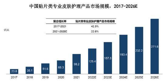 贴片类专业皮肤护理产品市场规模增长速度快于整体皮肤护理产品市场,市场发展潜力大。中国贴片类专业皮肤护理产品市场规模由 2017 年的 23.8 亿元增长至 2021 年的 98.2 亿元,年均复合增长率为 42.5%,快于同期的整体皮肤护理产品行业。未来,中国贴片类专业皮肤护理产品行业规范程度及居民保养意识将进一步提升,消费群体随之不断扩大,国内贴片类专业皮肤护理产品行业也将稳步增长,预计市场规模将在2026年增长至271.8亿元,年均复合增长率为22.6%。