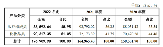 根据招股书显示,敷尔佳2022年共收入17.69亿元,同比2021年(16.50亿元)增长7.21%。其中,医疗器械类产品收入8.66亿元,占全部收入的48.95%;化妆品类收入为9.03亿元,占51.05%。