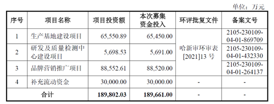 据招股书显示,本次发行募集资金,敷尔佳计划用于生产基地建设项目、研发及质量监测中心建设项目、品牌营销推广项目、补充流动资金,计划募集资金投入分别为6.55亿元、5691万元、8.85亿元、3亿元,合计18.97亿元。可以看到,其中将用于品牌营销推广的资金占比达到46.65%。