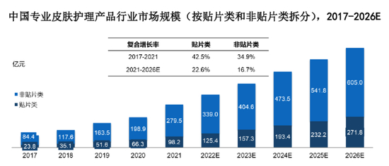 贴片类和非贴片类专业皮肤护理产品的市场规模由 2017 年的 23.9 亿元和 84.4 亿元增长至 2021 年的 98.2 亿元和 279.5 亿元,年均复合增长率为 42.5% 和 34.9%。预计到 2026 年,贴片类和非贴片类专业皮肤护理产品的市场规模将达到 271.8 亿元和 605.0 亿元。