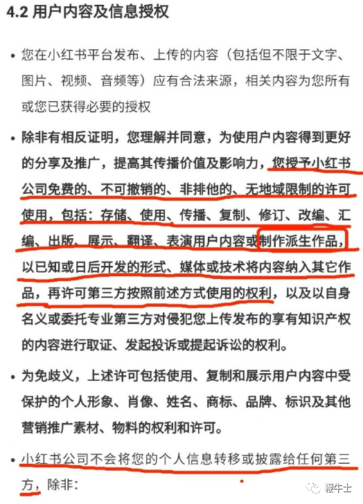 其中在其4.2关于内容及信息授权中指出“用户授予小红书公司免费的、不可撤销的、非排他的、无地域限制的许可使用,包括存储、使用、传播、复制、修订、改编、汇编、出版、展示、翻译、表演用户内容或制作派生作品等。”