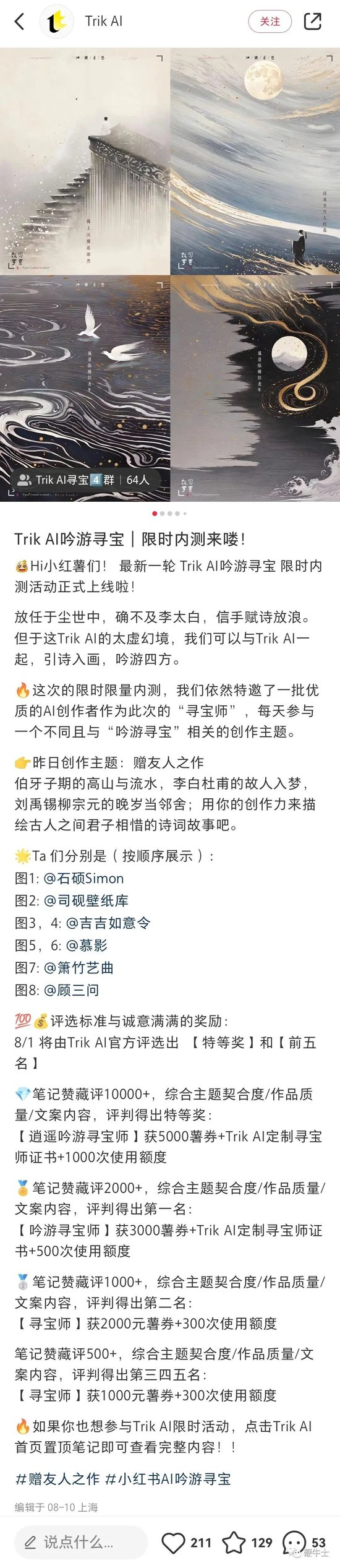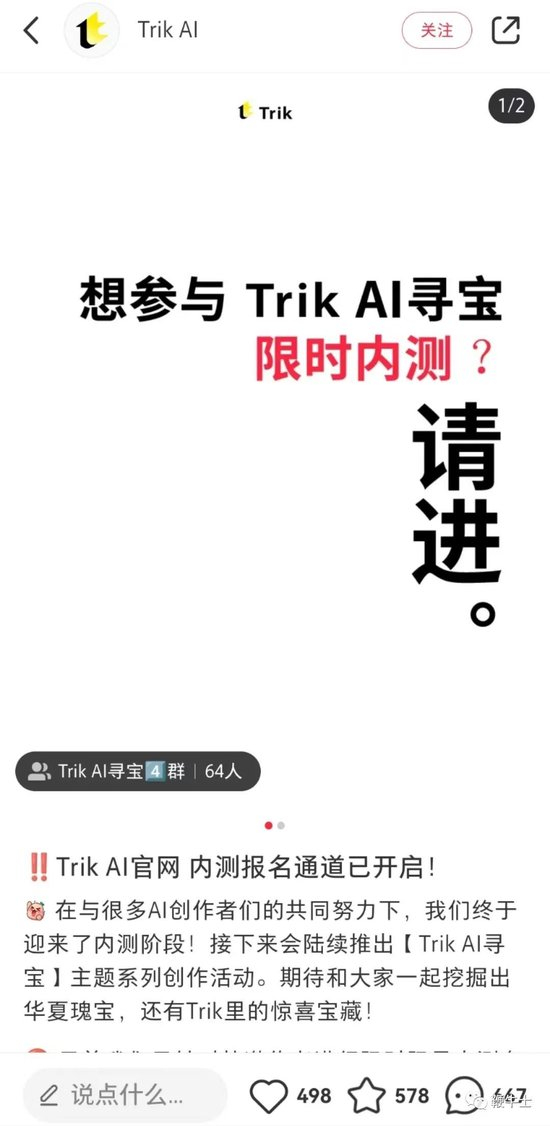鞭牛士注意到,小红书Trik AI在8月7日发文开启内测阶段,并推出“Trik AI寻宝”活动,针对特邀作者进行限时限量内测名额开放,而这些作者也被官方称为AI创作者。