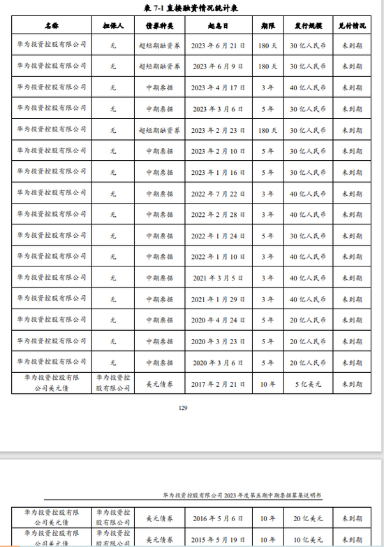 截至募集说明书签署之日起,华为存续期境内中期票据和超短融合计金额为510亿元,远超存续境外美元债券35亿美元(约合人民币255亿元)。