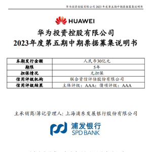 8月23日,华为发布第五期中期票据申购说明,拟发行30亿元,债务融资工具5年,利率申购期间2.78%至3.38%,主承销商为浦发银行,联席主承销商为建设银行,发行日期为8月24日至25日。