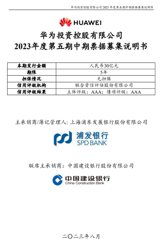 8月23日,华为在上海清算所和北京金融资产交易所发布第五期中期票据申购说明书,拟发行30亿元,利率申购期间2.78%至3.38%。