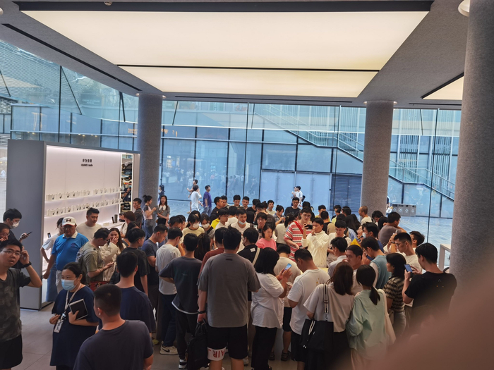 上证报记者在深圳南山区万象天地华为旗舰店看到,华为Mate 60 系列的Pro版本和标准版已经到货,现场人山人海,来领取新机的顾客排起长队。