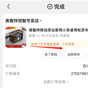 日前,消费者杨先生在京东商城上花费429元购买了一款家用沙发边几茶几,订单截图显示,该商品“支持7天无理由退货,7天价保”。