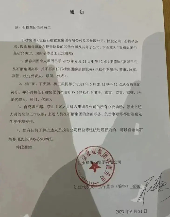 1. 桑春华已于2023年6月21日被石榴集团解除劳动合同及全部职务,因此之后不存在“石榴集团桑春华”的说法。