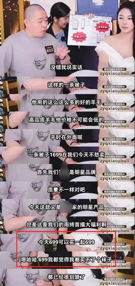 就像之前张雨绮在直播间卖羊毛被介绍到价格时,她在一旁脱口而出到“699,我都觉得我都买不了袜子”,此话一出也直接惹怒全网。