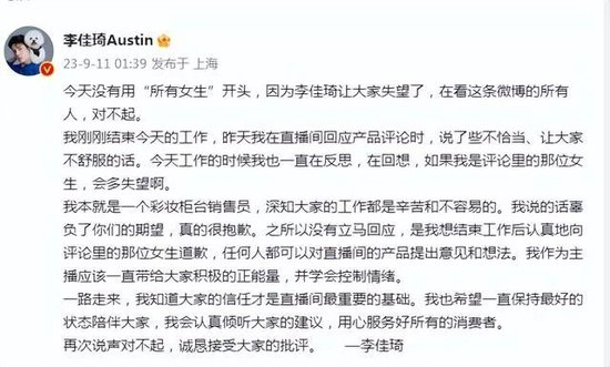 今天(9月11日)凌晨1点多,李佳琦就直播间为“怼网友”在微博发文道歉。他表示,自己在昨天的直播间回应产品评论时,说了些不恰当、让大家不舒服的话。之所以没有立马回应,是他想结束工作后认真地向评论里的那位女生道歉。道歉博文的最后,李佳琦再次表达了歉意,并表示愿意接受大家的批评。