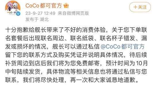 对此,CoCo都可官方27日中午又一次道歉回应,称“十分抱歉给舰长带来了不好的消费体验,关于您下单联名套餐后出现联名周边、联名纸袋、联名杯子错发、漏发或损坏的情况,舰长可以通过私信@CoCo都可官方 留下您的联系方式及购买凭证并说明具体情况,待后续补货周边到店后我们将为您免费邮寄,预计时间为10月中旬陆续发货,具体物流等相关信息也将通过私信与您联系,我们将尽快处理,再一次和大家诚恳地道歉。”