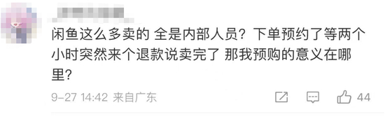 “闲鱼这么多卖的全是内部人员?下单预约了等两个小时突然来个退款说卖完了那我预购的意义在哪里?”