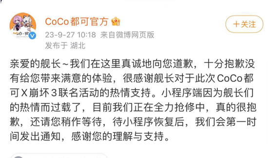 查询其官博发现,CoCo都可奶茶近日和游戏崩坏3开启联名活动,27日该活动刚上线就被部分消费者吐槽联名周边要钱、小程序崩溃、联名杯子错发、下单被无故取消等情况。对此CoCo都可在27日连发4条微博回应并道歉。