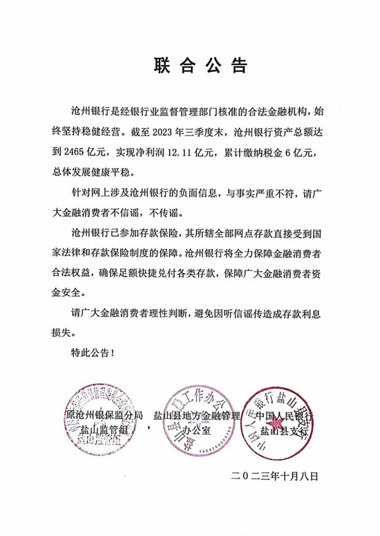 《联合公告》提示:“针对网上涉及沧州银行的不实信息,与事实严重不符,请广大金融消费者不信谣,不传谣。”