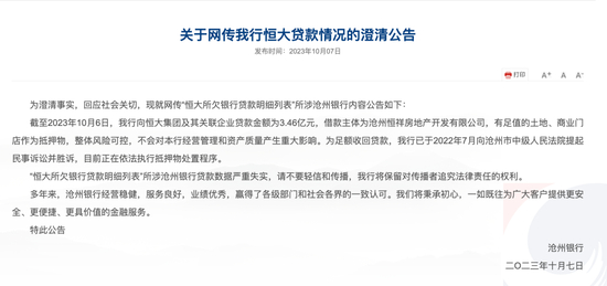 根据沧州银行7日发布的《公告》,截至2023年10月6日,该行向恒大集团及其关联企业3.46亿元贷款的借款主体是沧州恒祥房地产开发有限公司,有足值的土地、商业门店作为抵押物,整体风险可控,不会对该行经营管理和资产质量产生重大影响。为足额收回贷款,沧州银行已于2022年7月向沧州市中级人民法院提起民事诉讼并胜诉,目前正在依法执行抵押物处置程序。