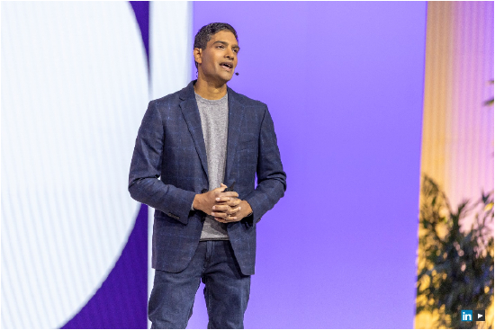 在曼哈顿Jarvit会展中心,领英人才解决方案业务的产品管理副总裁哈里·斯里尼瓦桑(Hari Srinivasan,以下简称哈里)接受了新浪科技的专访,就AI技术,尤其是最热的生成式AI,给全球人力资源行业和职场学习与培训带来的巨大冲击谈了他的看法,并介绍了他负责打造的领英AI新产品。