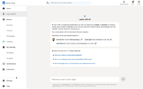“正如领英CEO瑞恩·罗斯兰斯基(Ryan Roslansky)所说,到2030年我们工作所需技能的65%都会发生变化。我们需要不断学习,掌握新的工作技能,适应新的工作内容,也需要新的学习方法。在领英的学习平台上,用户正在越来越多地学习AI技能课程,而AI工具也在改变我们学习和培训的方式。AI智能导师就是为了让用户在AI时代掌握新技能的有效手段。”