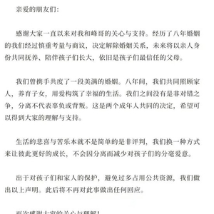 经历了八年婚姻的我们经过慎重考量与商议,决定解除婚姻关系,未来将以亲人身份共同抚养、陪伴孩子们长大,依旧是孩子们最信任的父母。