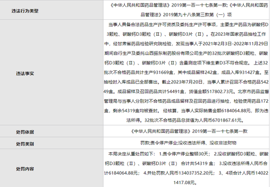 行政处罚信息显示,在2023年国家药品抽检工作中,经甘肃省药品检验研究院检验,朗迪制药的相关批次药品不合格:2021年2月3日至2022年11月29日期间,朗迪制药自行生产及委托山西振东制药公司生产的32批次碳酸钙D3颗粒、碳酸钙D3颗粒(Ⅱ)、碳酸钙D3片(Ⅱ),其含量测定项的维生素D3不符合规定。