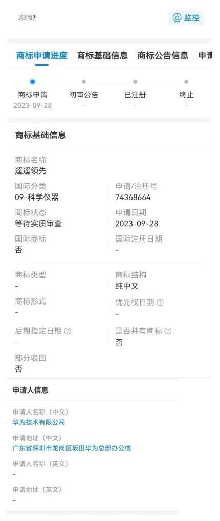 天眼查App显示,近日,华为技术有限公司申请注册“遥遥领先”商标,国际分类为运输工具、科学仪器,当前商标状态为等待实质审查。