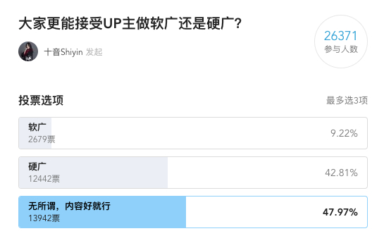 当然,恰饭视频的表达方式也对视频效果有影响。众所周知,广告可以分为软广和硬广。通俗点说,在B站,软广就是“我不告诉你我在打广告,有可能我是在打广告”,硬广是“我直接告诉你,我就是在打广告”。很多人认为相对于硬广,软广是更能被UP主所接受的方式。但时尚区百大UP主@十音Shiyin做过一个关于恰饭视频的投票,B站用户似乎更喜欢硬广,因为观众更喜欢被告知,也更喜欢更加真实的体验。而我们的分析结果也验证了这一点,常常发软广的UP主的粉丝数会显著减少。