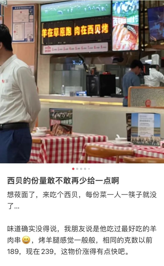 问题还不止是贵。社交平台上,不少消费者抱怨去西贝越来越吃不饱了。小红书上,有网友晒出账单明细,包括4份主食、2个热菜、1个酸奶,花了两百还没吃饱,“真是彻底拜拜”。还有消费者表示“来吃个西贝,每份菜一人一筷子就没了...烤羊腿相同的克数以前189,现在239,这物价涨得有点快吧。”