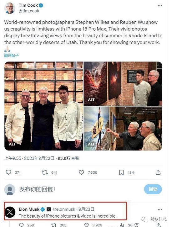 这次的赞扬是在库克分享了一位摄影师用iPhone 15 Pro Max拍摄的照片后发生的。这些照片展示了iPhone 15在摄影方面的出色表现,令人惊叹。马斯克对这些照片的美感和画质给予了高度评价,显示出他对iPhone 15的认可和赞赏。
