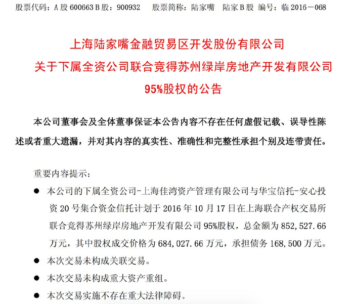 2016年10月18日,陆家嘴发布公告,以85.25亿元的价格竞得苏州绿岸房地产开发有限公司95%的股权/图源:公告截图