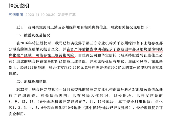 2023年11月10日凌晨,苏钢集团发布情况说明,回应“毒地块”事件/图源:情况说明部分截图