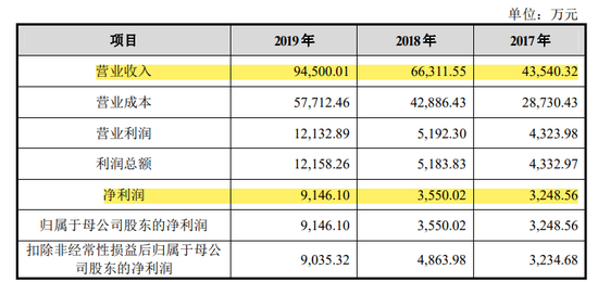相反的是,老铺黄金独立出来后,业绩却突飞猛进,2017年-2019年的营收分别为4.32亿元、6.51亿元、9.27亿元,净利分别为3248.56万元、3550.02万元、9146.1万元。