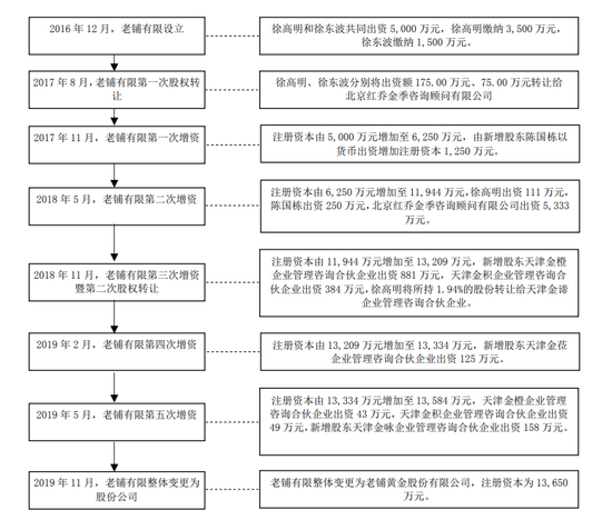 然而奇怪的是,在老铺黄金披露的股本形成情况中,并未发现红乔金季对老铺黄金进行过2.4亿元的增资。乐居财经《预审IPO》查阅发现,红乔金季第一次入股老铺黄金是在2017年8月,通过受让徐高明、徐东波父子转让的250万元股权。此后,其仅于2018年5月向老铺黄金增资过5333万元。