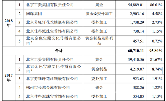 此外,剥离老铺黄金后,金色宝藏还对其进行着“供养”。招股书显示,2017年金色宝藏为老铺黄金的第二大供应商,老铺黄金向其采购黄金制品及陈列品的金额达4219.07万元。2018年,老铺黄金向金色宝藏的采购额降至457.51万元,但金色宝藏仍是老铺黄金的第五大供应商。