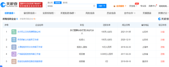天眼查App显示,旭旭宝宝(任怡旭)关联的5家企业均已注销。其中,上海旭旭宝宝文化传媒工作室和青岛无影文化服务工作室为其个人独资企业;青岛荒古文化传媒有限公司由青岛无影文化服务工作室持股99%,任怡旭在该公司担任法定代表人及执行董事兼总经理;广饶县旭旭宝宝传媒工作室和忠县任怡商务信息咨询服务部为个体工商户,任怡旭为经营者。