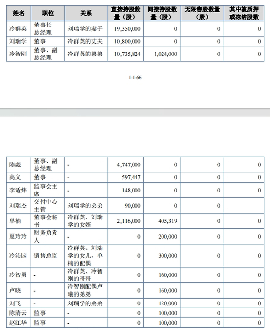 除了冷、刘夫妇,其不少家族成员也在公司持有股份,并担任要职。其中,冷群英的弟弟冷智刚作为创始股东之一,递表前仍持有公司14.02%的股份,与刘瑞学所持股份基本持平,同时还担任公司董事、副总经理之职。