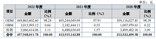 2020年-2022年,芭薇股份ODM模式销售金额分别为3.09亿元、4.05亿元、4.5亿元,占当期营业收入等比例分别为98.59%、97.91%、98.24%。