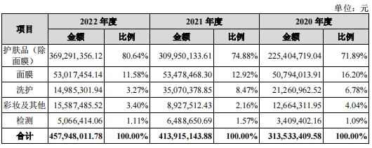 从事化妆品的研发、生产、销售及检测,芭薇股份的产品类别涵盖护肤品、面膜、洗护、彩妆等全品类化妆品。其中,护肤品为支柱性收入来源,2022年占比超8成。
