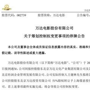 公告显示,万达电影间接控股股东北京万达文化产业集团有限公司(以下简称“万达文化”)及其全资子公司北京珩润企业管理发展有限公司(以下简称“北京珩润”)、公司实际控制人王健林,拟将其合计持有的北京万达投资有限公司(下称“万达投资”)51%股权,转让给上海儒意投资管理有限公司(下称“上海儒意”)。