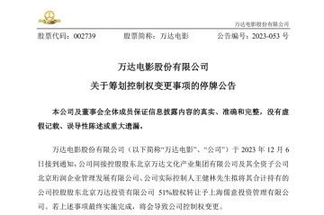 12月6日,万达电影股份有限公司(以下简称“万达电影”)发布关于筹划控制权变更事项的停牌公告。