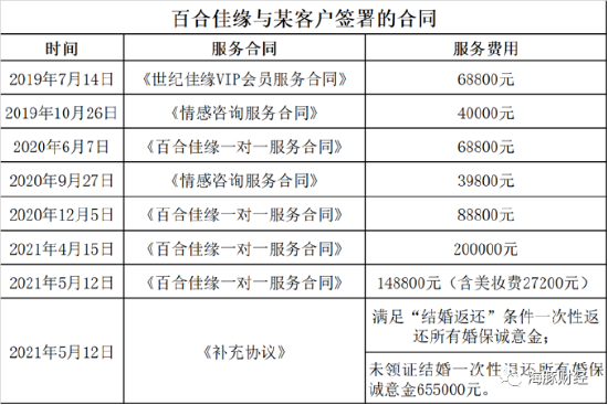 2023年4月8日,中国裁判文书网披露的《贾某婷与北京花千树信息科技有限公司服务合同纠纷二审民事判决书》显示,2019年4月7日、2020年3月26日,贾某婷分别与北京花千树信息科技有限公司(绝对100婚恋网主体,2013年被世纪佳缘收购,简称“世纪佳缘”)签订《百合佳缘一对一服务合同》约定,服务时长12个月,约见人数12人,服务金额68800元。两份合同共计137600元。