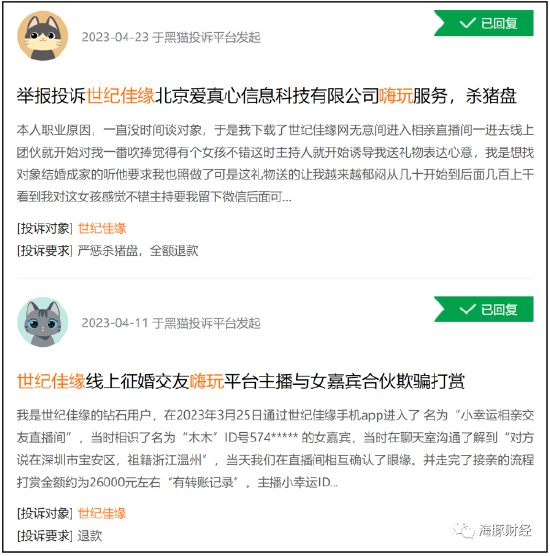 邱某遭遇的情况并非个例。在黑猫平台,有多位网友发帖反映,世纪佳缘红娘(主持人)与女主播联合套路用户,不断怂恿、诱导用户给女主播刷礼物。