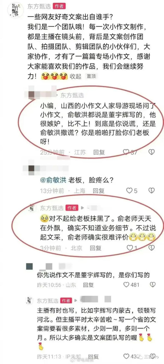 在这则视频的评论区,东方甄选小编留言称,“一些网友好奇文案出自谁手?我们是一个团队哦!每一次‘小作文’制作,都是主播在镜头前,背后是文案创作团队、拍摄团队、剪辑团队的小伙伴们,大家协作,才有了一篇篇专场‘小作文’,感谢大家能喜欢我们的作品,我们会继续努力!”