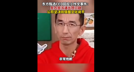 此前的12月12日晚,东方甄选CEO孙东旭在直播间已正式回应近期小作文事件,全程回应约10分钟。主要内容有:批评小编团队,工作带有情绪,沟通方式不恰当;宇辉情绪受到影响,因此10日临时决定不进行直播;公司对董宇辉贡献认可,待遇上没有亏欠,其年薪不止网传的几千万;向公司客户表达歉意,但坚决向饭圈行为说不,希望部分粉丝保持冷静。