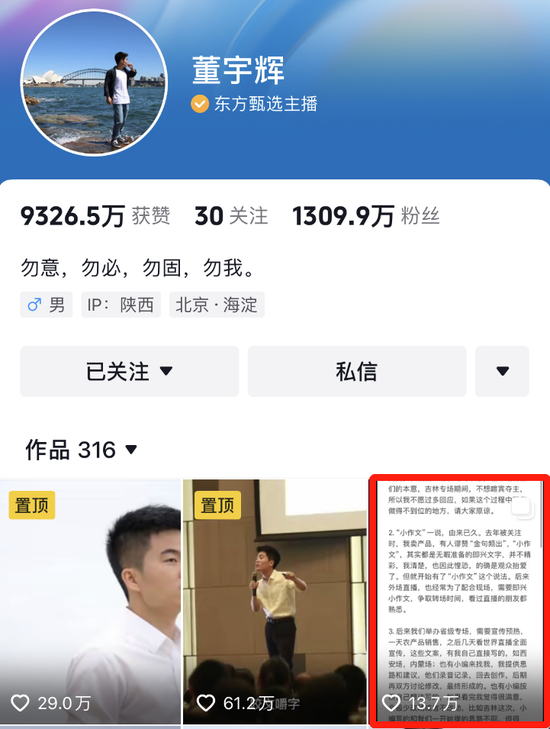 今天,各方的回应终于齐了。今日凌晨,董宇辉发长文回应了近日引发大量关注的“小作文”事件。他表示,东方甄选举办省级专场的这些“小作文”文案,有自己直接写的,比如西安场、内蒙古场;也有自己给小编提供思路和建议,他们录音记录回去创作,后期再双方讨论修改,最终形成的;还有小编按照自己想法写的,如果自己感觉满意,也不会改动或者少改动。
